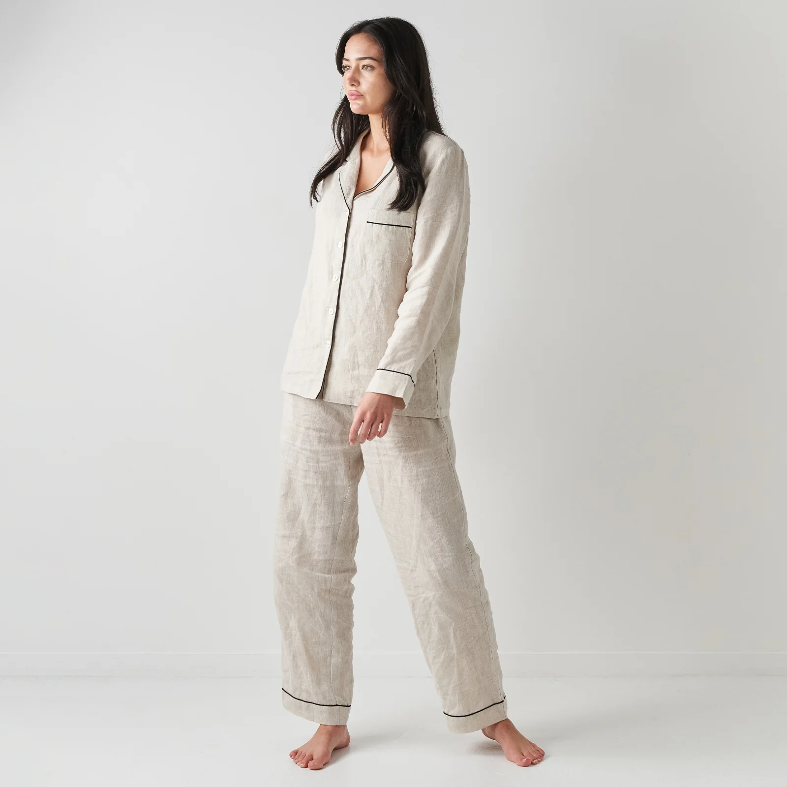It's one thing to enjoy our coveted Linen Bedding, but let yourself take it to a whole new level of comfort by wearing linen to bed too. Crafted in our signature premium French Flax Linen fabric, this clever little Pyjama Set in Natural with long sleeve shirt and long pants features chic piping details, comfortable pockets and a low rise waist to avoid any unnecessary tightness as you sleep. In short they're designed for your best, cosiest sleep yet.